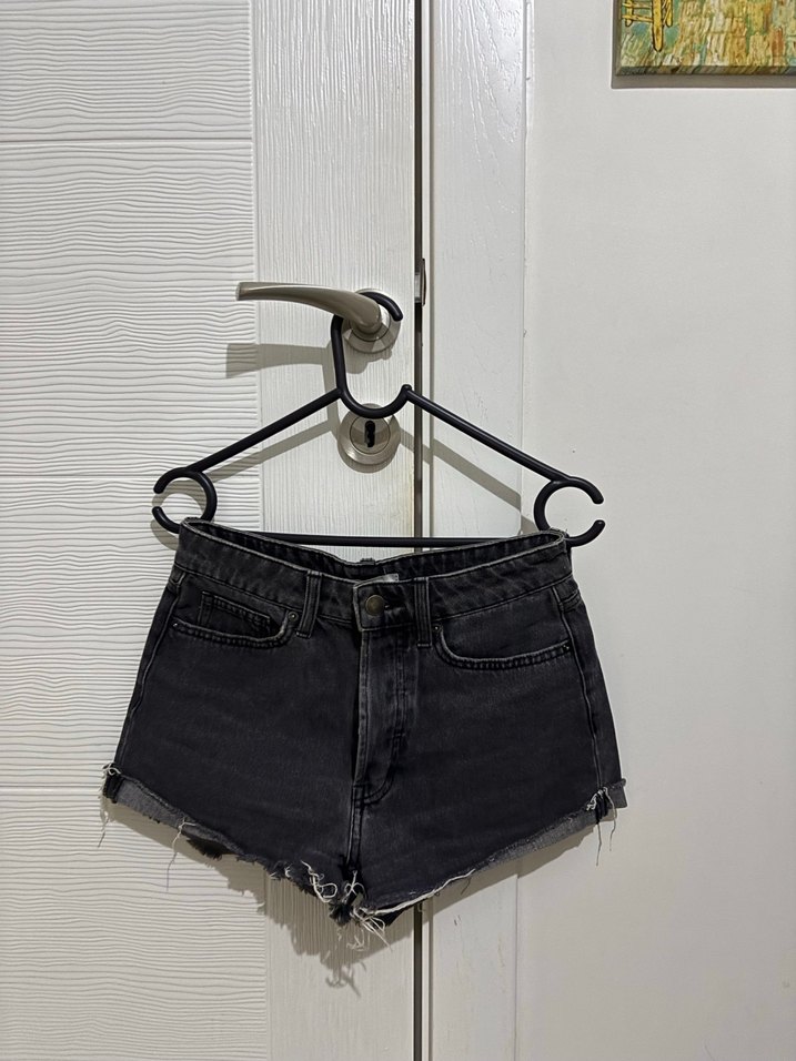 Gri mini denim şort, kemerli ve dar kesimli. Sokak tarzı ve hafif batik desenli, günlük kullanıma uygun.