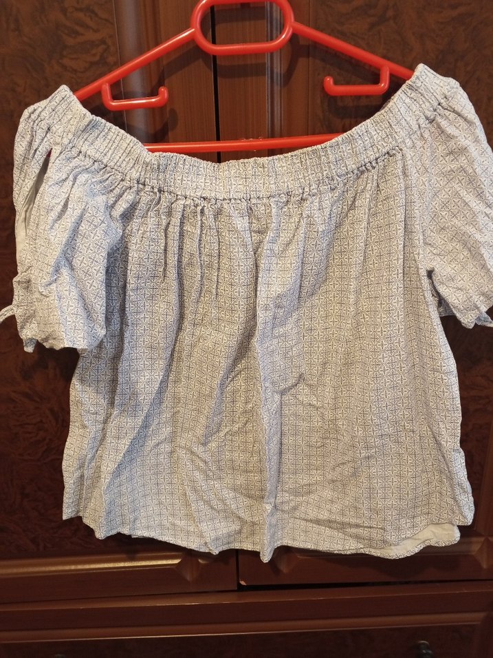 Gri keten kumaştan, kısa kollu, tekne yakalı, pile detaylı bol kesim mini bluz.