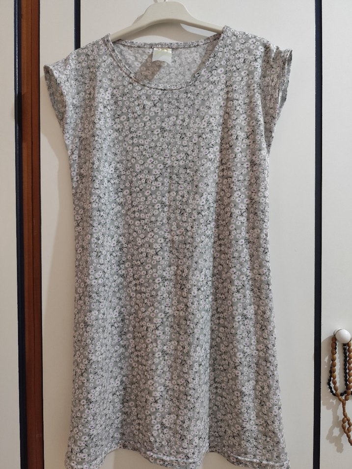 Gri renkli, kısa kollu, bol kesim mini elbise. Sentetik kumaş, hafif batik desenli, günlük kullanım için rahat ve şık bohem tarzı sunar. s m bedenlere Uygun, hiç bir sıkıntısı yok yep yeni