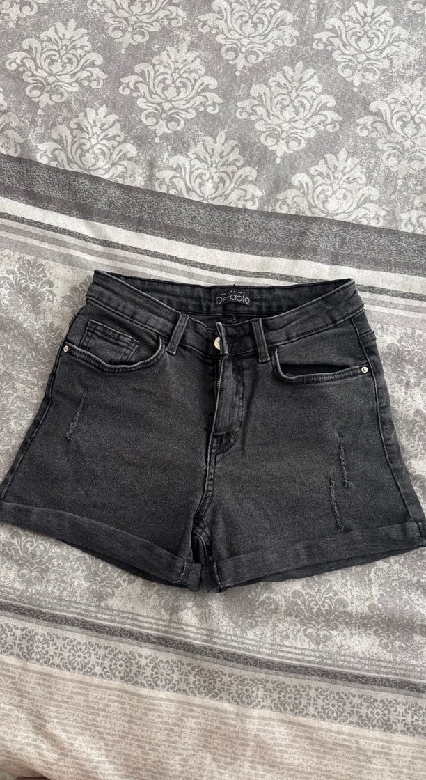Gri renkte mini uzunlukta kot şort., desen içermeyen günlük ve sokak stiline uygun rahat tasarım.