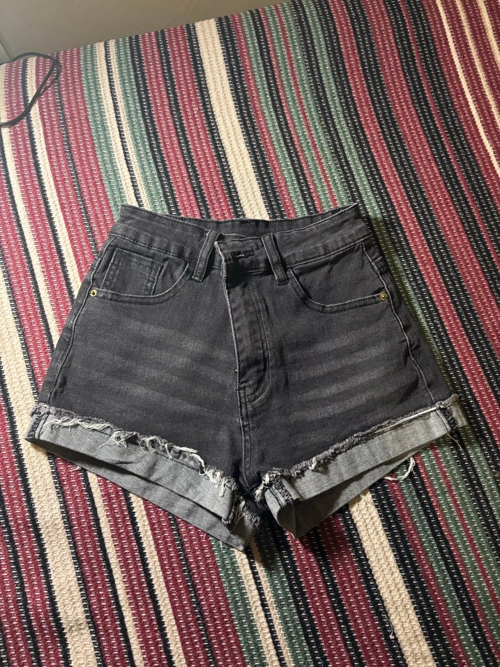 Gri kot şort, katlama modeli kısa boyda, yıpranmış kenar detayına sahip, trend sokak stili için uygun. YURT DIŞINDAN ALINDI(13 euroya almıştım)