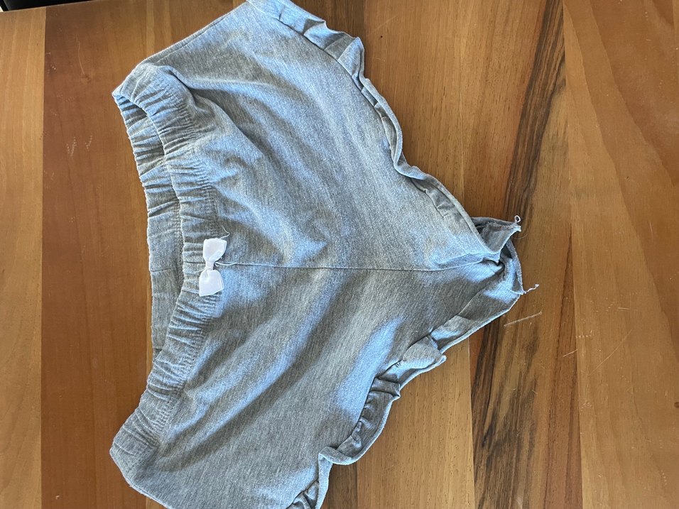 Gri kot kumaştan, bol kesim mini şort, fırfır detaylı ve küçük fiyonk süslemeli, günlük rahat kullanım için uygundur.