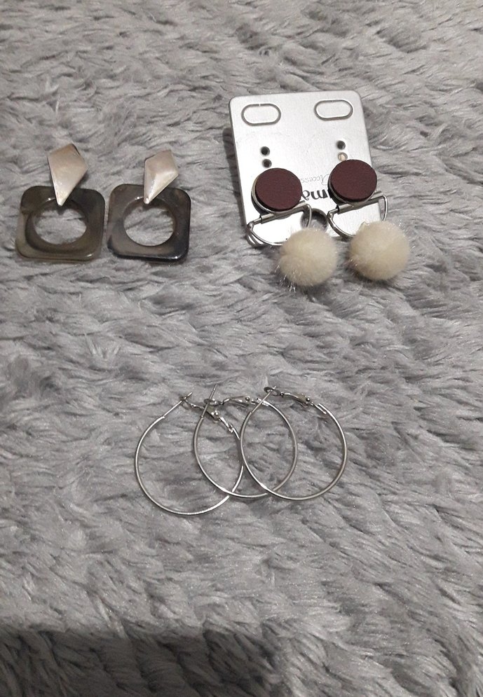 Gri tonlarında, mini kürk detaylı ve sade geometrik şekilli üç çift kadın küpe seti, günlük kullanıma uygun.