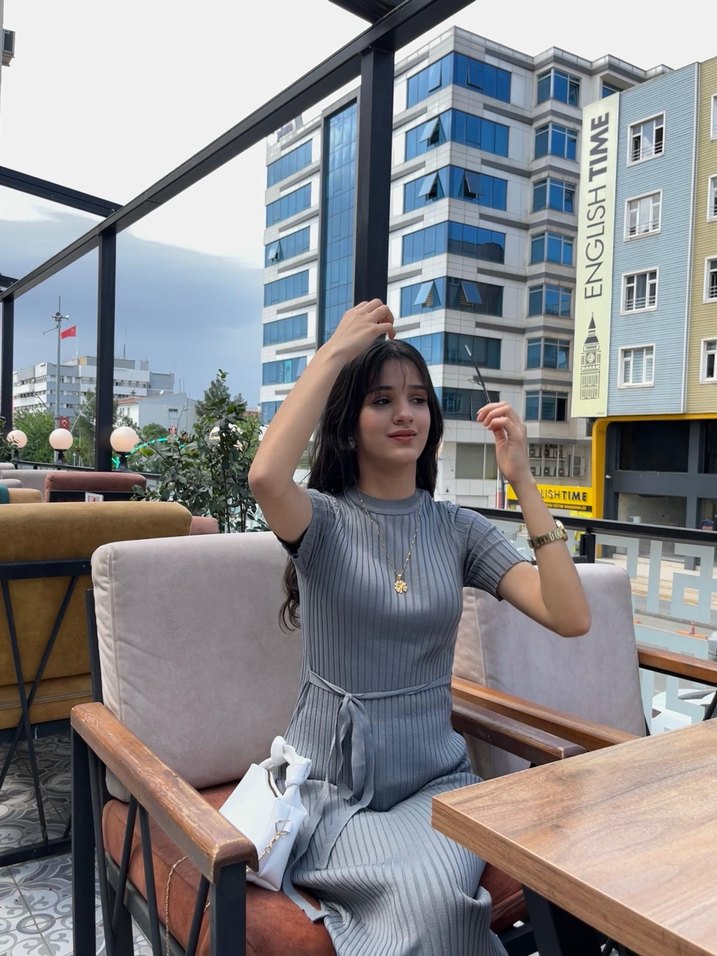 Düz yakalı, kısa kollu ve hafif batik desenli, vücuda oturan gri örme mini elbise, günlük şıklık sunar.