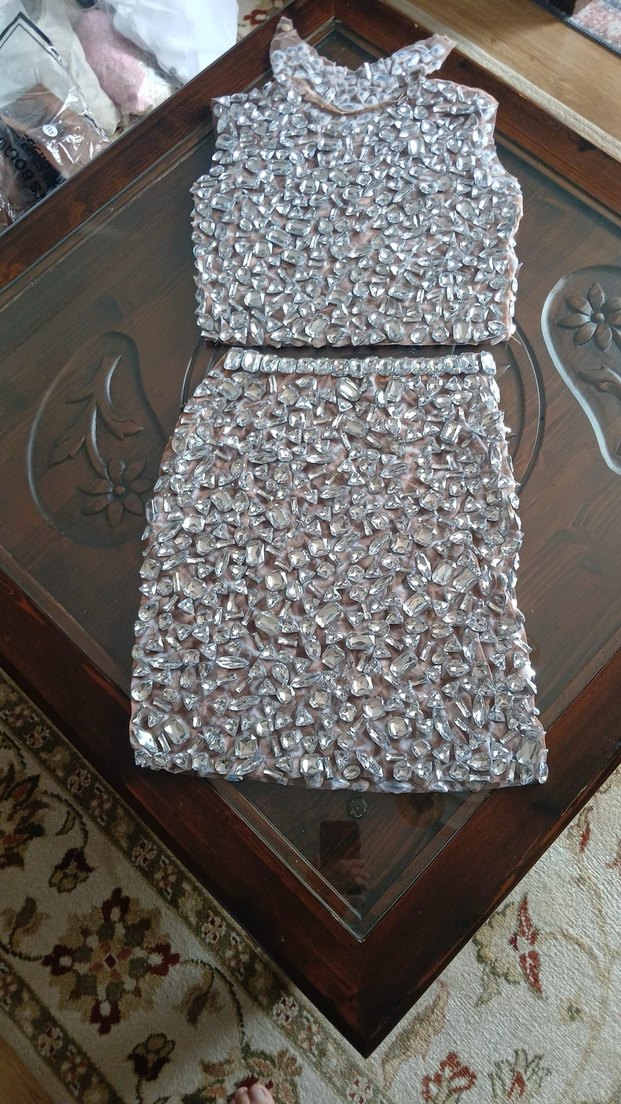 Gri mini abiye elbise, straplez yakalı ve payetlerle kaplıdır. Düğünler için şık ve modern bir görünüm sunar. ✨