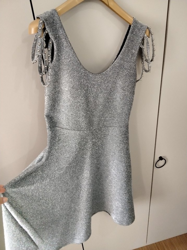 Payetlerle süslenmiş, kolsuz, V yakalı gri mini abiye elbise. Fitted kesim ve özel omuz detaylarıyla parti için uygun. ✨ L BEDEN 38