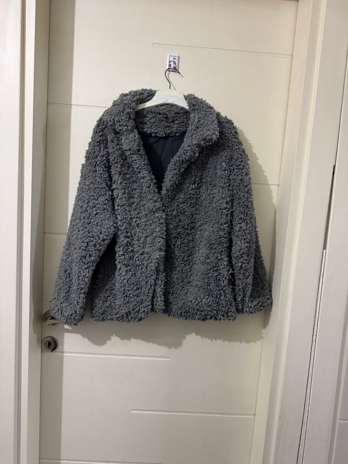 Gri mini ceket, yumuşak peluş kumaş ve tüy detaylıdır. Notlu yaka ve uzun kolludur, rahat ve trend bir görünüm sunar.