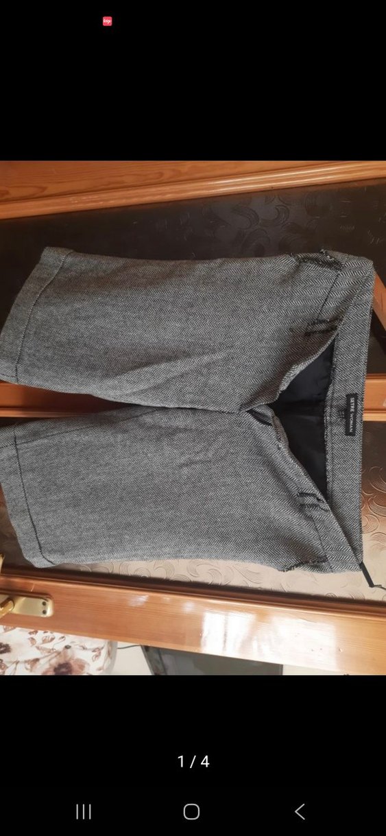 Gri renkli, mini uzunlukta, kemerli ve regular fit kadın kumaş pantolon. Yumuşak sentetik kumaştan yapılmış, ofis için uygun rahat ve trend görünümlü.