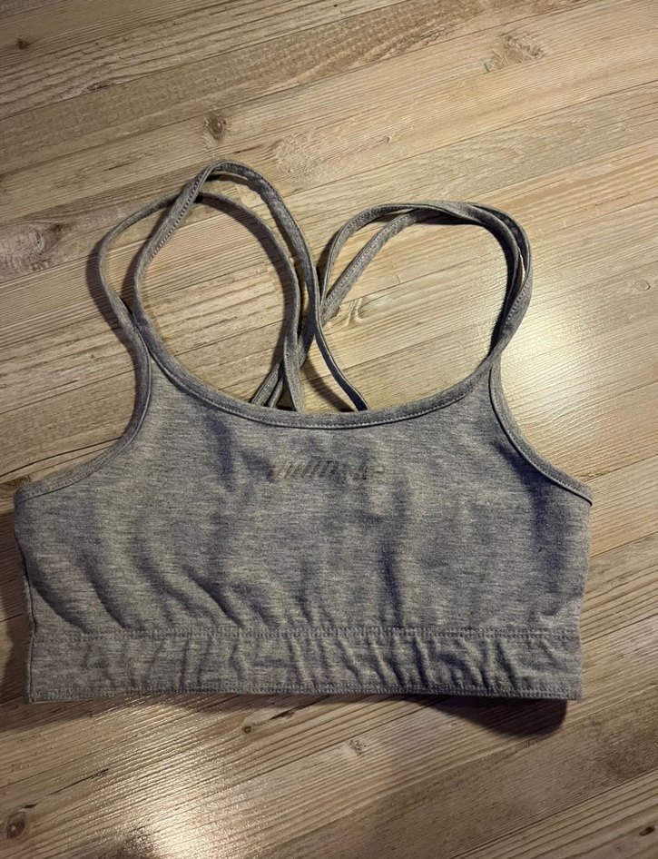 Gri renkte, ince askılı, kısa kesim mini spor sütyeni, athleisure tarzında sade ve şık. Arkasi capraz