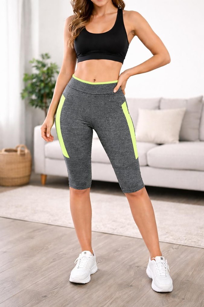 Sentetik kumaştan, kemerli ve neon yan detaylı gri mini spor tayt, sportif sokak stili için uygundur.