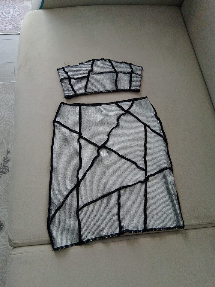 Gri renkte, straplez yaka ve vücuda oturan mini kalem etek. Kısa boyu ve çağdaş tasarımıyla avant-garde bir tarz sunar