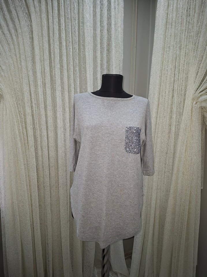 Gri renkli, yuvarlak yaka ve uzun kollu bol kesim mini triko kazak. Payetli cep detayıyla günlük rahat kullanıma uygundur.