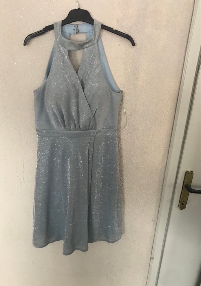 Kolsuz, gri mini abiye elbise, v yaka ve drapeli detaylıdır. Parlak kumaşıyla parti için uygundur. ✨