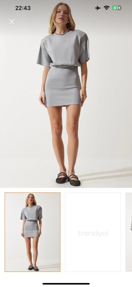 V yaka ve ince askılı, gri mini elbise. İnce ve rahat sentetik kumaştan, günlük kullanıma uygun sade ve şık.
