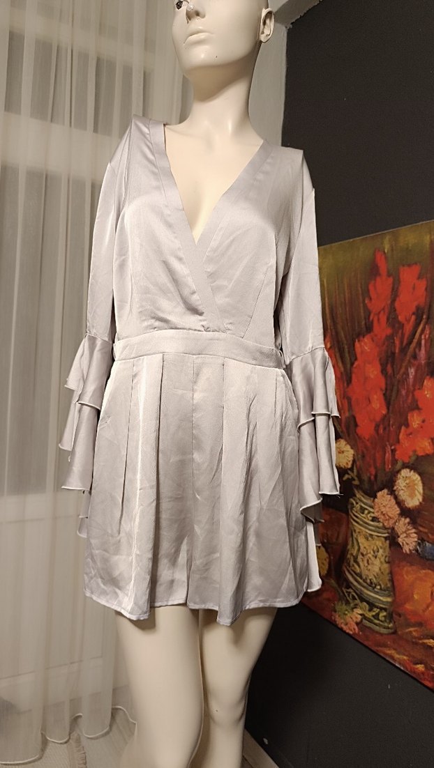 Gri renkte, saten dokulu, salaş kesim mini elbise. Uzun kollu, V yaka ve drapeli detaylara sahip, bohem tarzı yansıtıyor. ️
