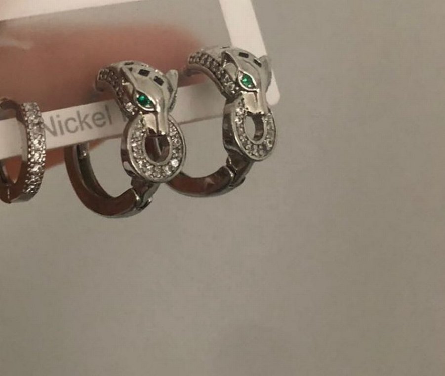 Kısa gri küpeler, yılan deseni ve payet detayları ile yeşil taşlı gözlere sahip, romantik akşamlar için ideal.