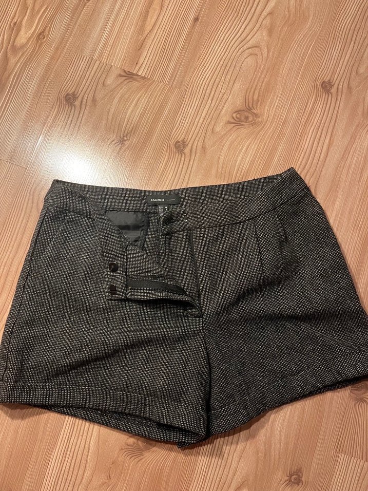 Yumuşak yün kumaştan %41, düğmeli ve fitted kesim gri mini kadın şort, ofis ve sokak stili için uygundur.