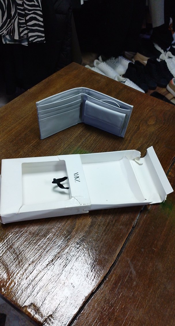 Gri renkli erkek cüzdanı, minimalist tarzda, çoklu kart bölmeleri ve şeffaf kimlik penceresi içerir.