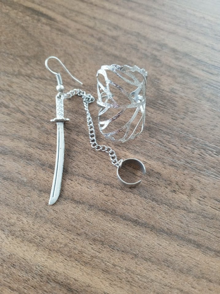 Gri minimalist tarzda, kılıç figürlü ve zincirle bağlı halka detaylı erkek küpe seti, sıradışı bir görünüm sunar. ⚔️