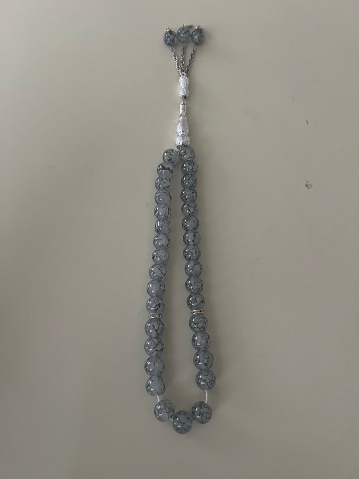 Gri renkli, minimalist tarzda, geleneksel şekilli erkek tesbihdir. Düzgün yuvarlak boncuklarıyla günlük kullanıma uygundur.