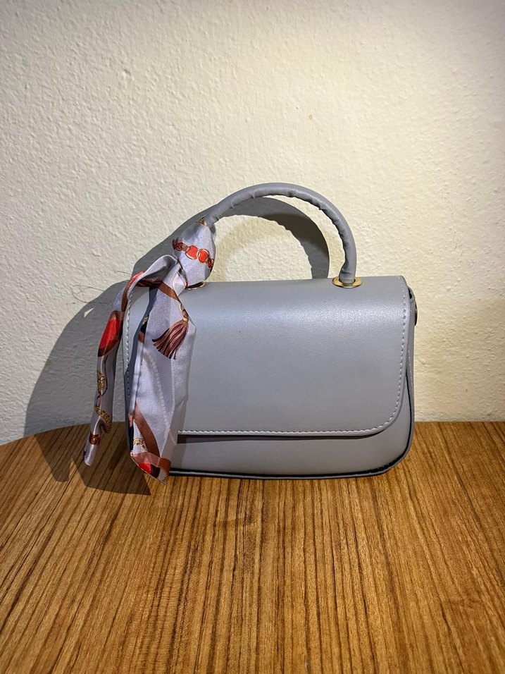 Gri kadın omuz çantası. Küçük sapı ve dekoratif fular detayına sahiptir. Günlük sokak stiline uygundur✨