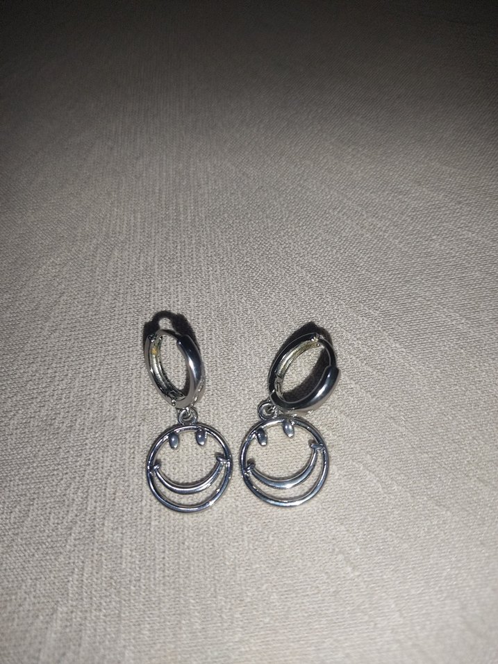 Gri minimalist halka küpeler, gülümseyen yüz figürlü, rock punk tarzına uygun sokak modası küpeleri.