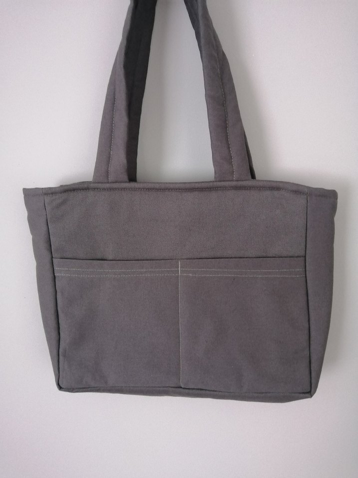 Gri renkte, keten kumaştan yapılmış minimalist kadın çantası. Önünde iki cep ve uzun saplar bulunur, günlük kullanım için uygundur.