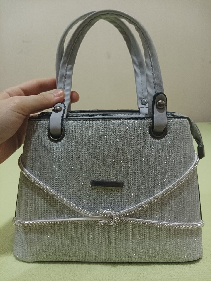 Gri sentetik kumaştan yapılmış, tokalı detaylı minimalist kadın el çantası. Günlük kullanıma uygun, klasik ve çağdaş tarzda, desensiz ve kullanışlıdır.