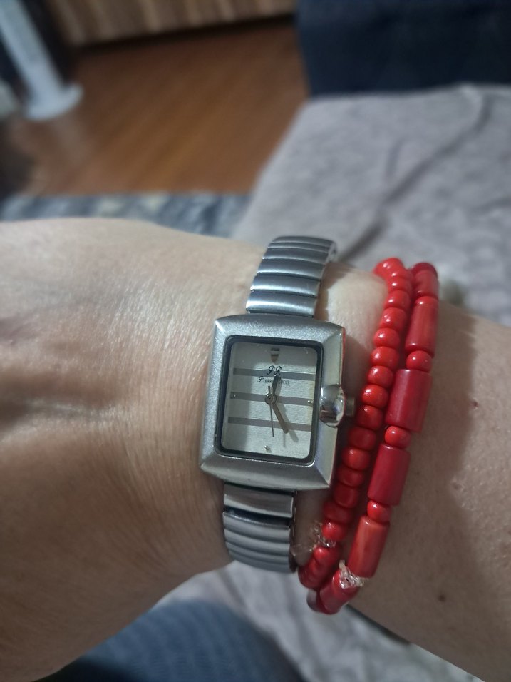 Gri minimalist dikdörtgen kadranlı, esnek metal kayışlı kadın kol saati. Kırmızı boncuklu bilekliklerle bohem tarzı tamamlar. ⌚ ve su geçirmez saat Almanyadan aldım