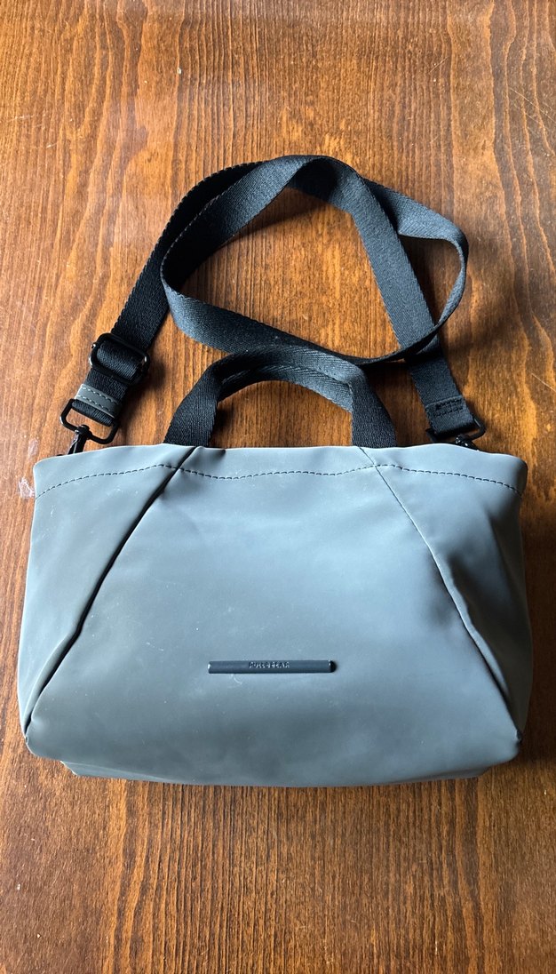 Sentetik kumaştan gri, tokalı ayarlanabilir askılı kadın çantası. Minimalist ve desensiz tasarımıyla günlük sokak stiline uygun.