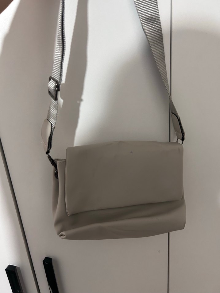 Gri renkte, kemerli tasarıma ve ayarlanabilir askıya sahip, yumuşak sentetik kumaştan yapılmış minimalist kadın omuz çantası.