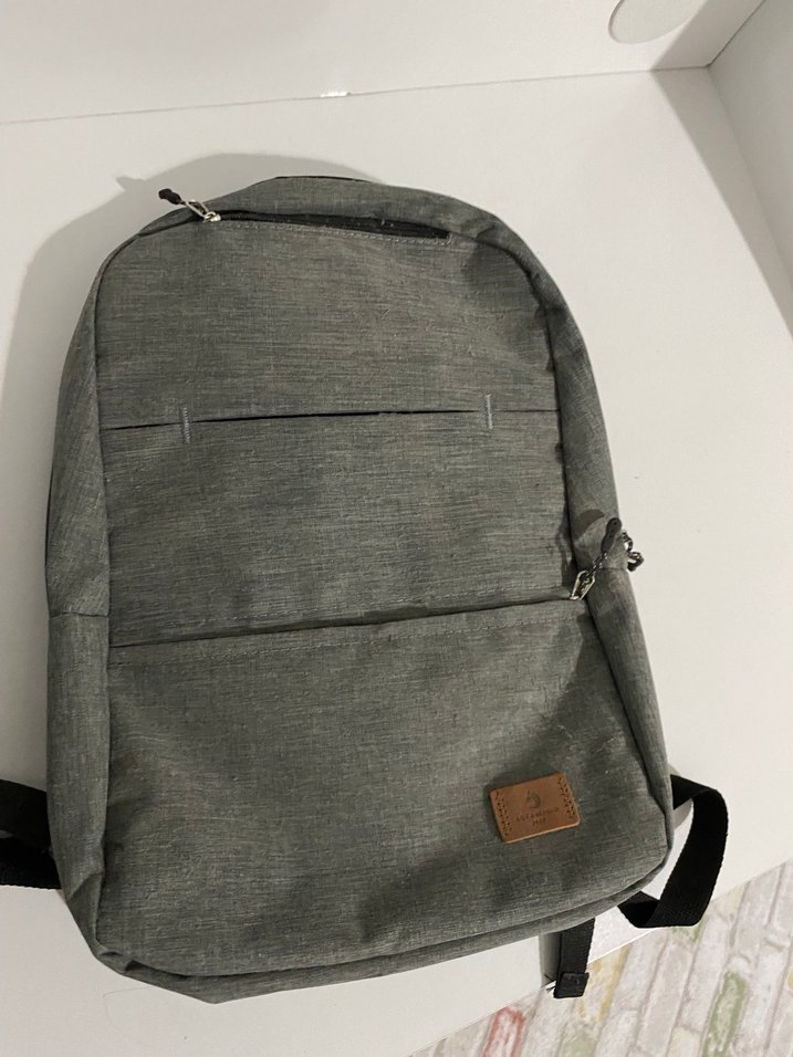 Gri renkli, sentetik kumaştan yapılmış, fermuarlı cepleri olan minimalist laptop çantası.
