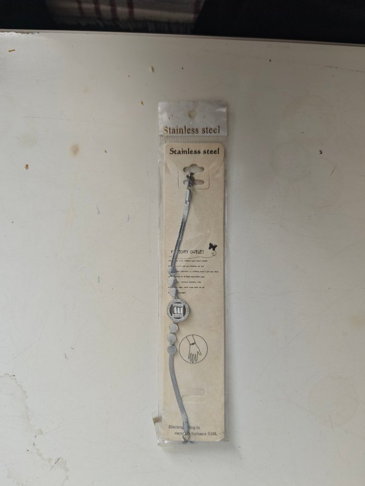 Gri zincir detaylı, baskılı bej renkte kadın bilekliği. Paslanmaz çelikten üretilmiştir, minimalist ve karşı kültür tarzına uygundur.