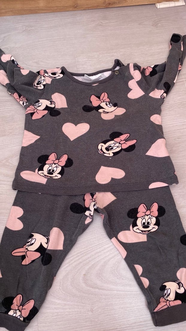 Gri renkli, uzun kollu ve örgü dokulu bebek kız takımı, Minnie Mouse desenleri ve kalplerle süslenmiştir. Rahat ve şık bir görünüm sunar.