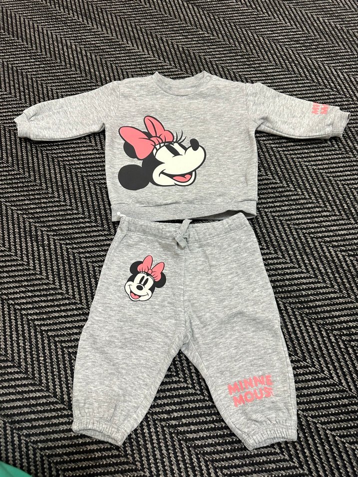 Gri renkli, Minnie Mouse baskılı, uzun kollu örme kumaştan bebek kız takımıdır.