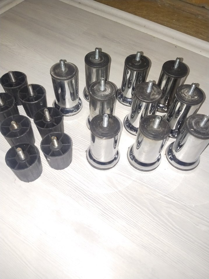 Metal ve plastik parçalı gri mobilya ayakları seti. Kolay montaj ve destek sağlar. Farklı ev mobilyaları için uygundur.