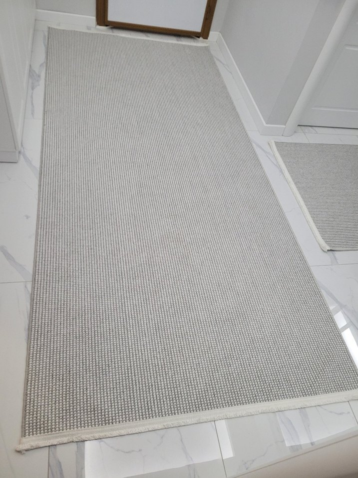 Gri renkte, desensiz ve modern tarzda tasarlanmış, sade görünümlü bir halı 140×310 100×365 100×130 özel ölçü olarak dikildi