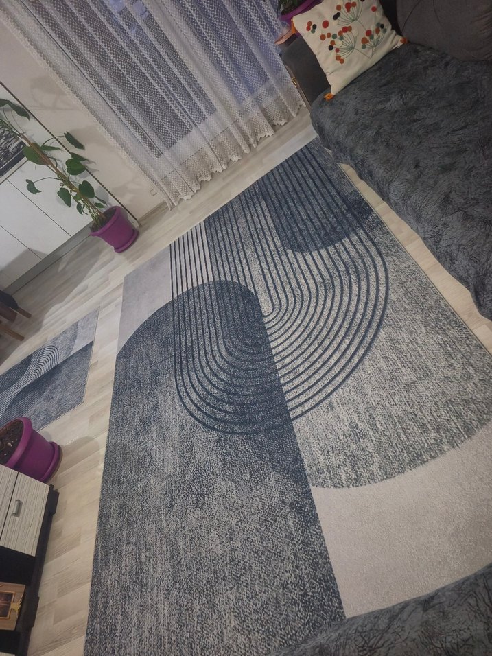 Hemen hemen 6 m2 halı kadardır. Gri modern halı, kıvrımlı çizgiler ve geometrik şekillerle desenlidir, mekana şık bir dokunuş katar.