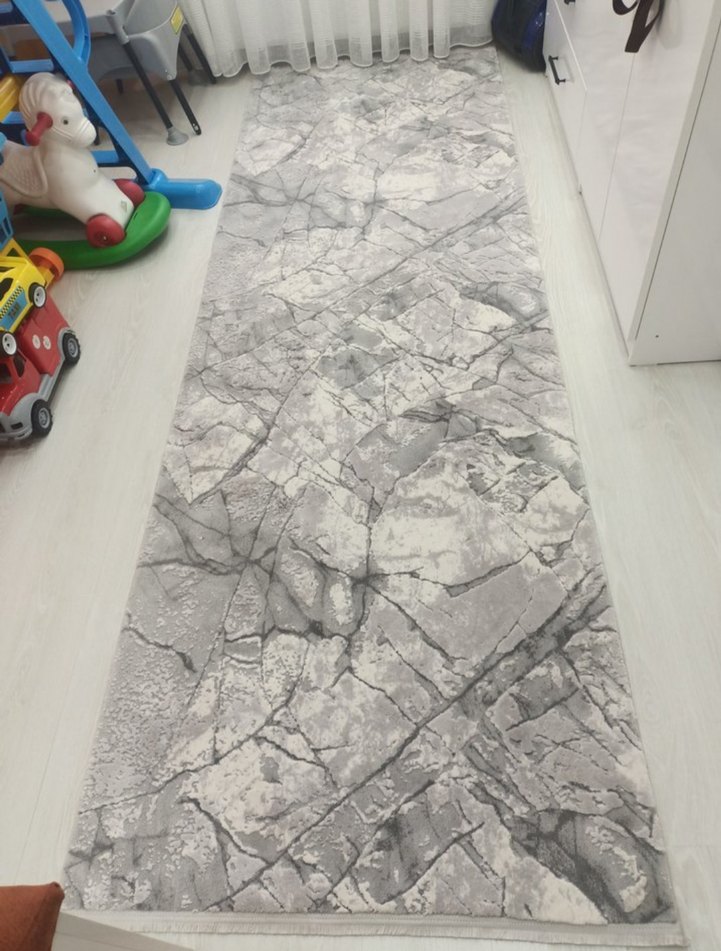 Gri renkte, modern tarzda, baskılı desenli bir halıdır. deforme yok kalın tabanlı lekesi yok en 1 boy 3 metre isteyene küçük parçasıyla birlikte verebilirim