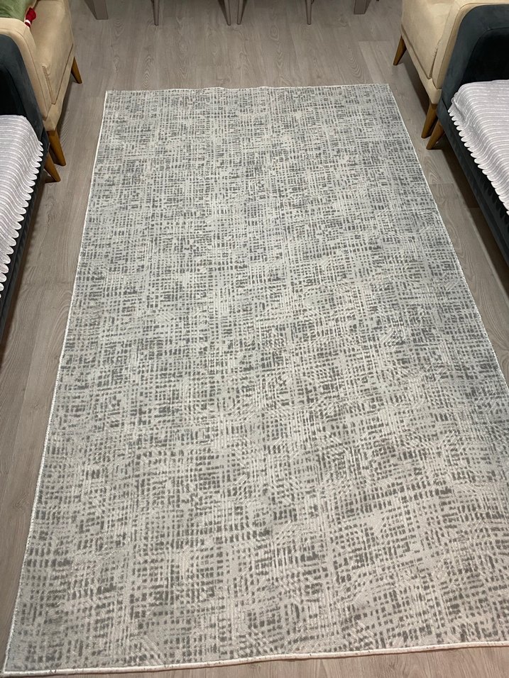 Modern tarzda, gri tonlarda, desensiz ve dokulu görünüme sahip halı, modern iç mekanlara uyum sağlar. Ölçüleri 150.250 hiç bir sorunu yok kesim halıdır sıfır