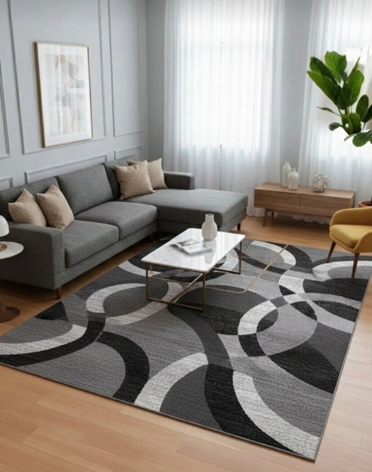 Gri renkte, iç içe geçmiş kavisli desenlere sahip modern tarzda halı, yaşam alanlarına şık bir dokunuş katar. süngerli kaymaz dot taban halı