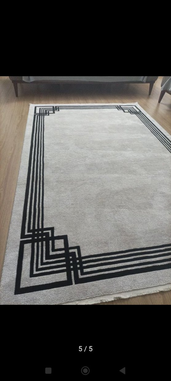 Gri modern halı, siyah geometrik kenar detayıyla sade ve şık bir görünüm sunar. 4 metre kare