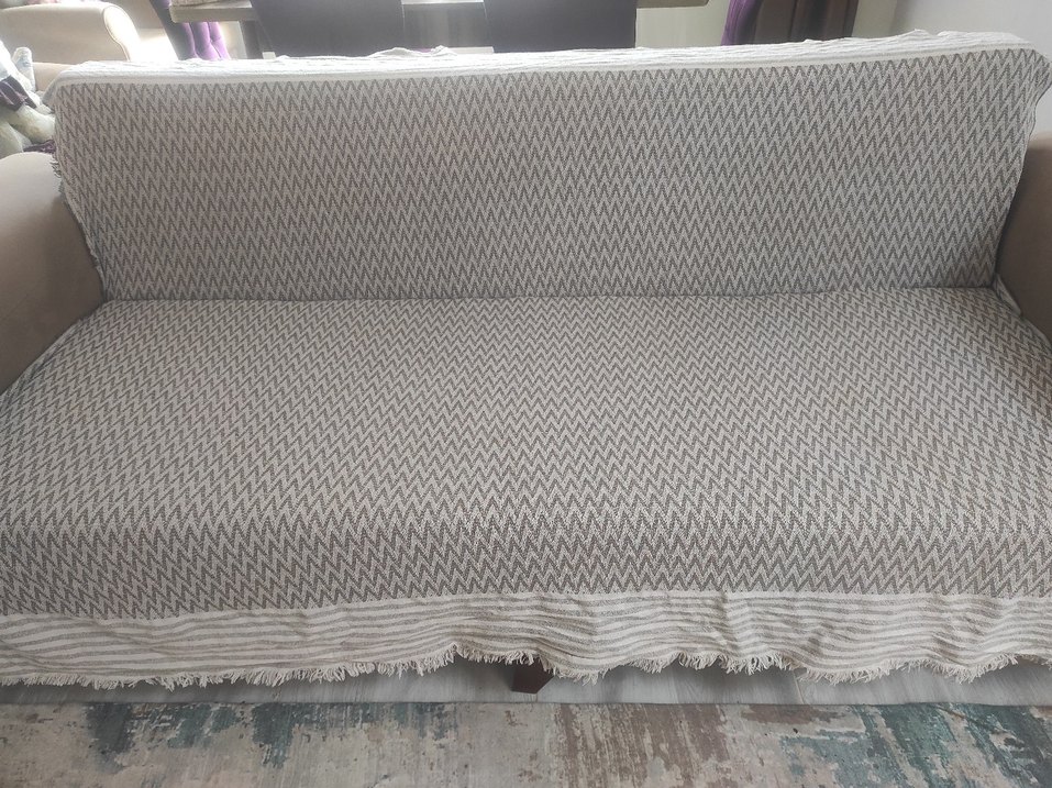 Gri renkte, zigzag desenli ve püsküllü kenarlarıyla modern tarzda kanepe örtüsüdür.2 tanedir Çeşitli kanepe modellerine uyumludur. ️