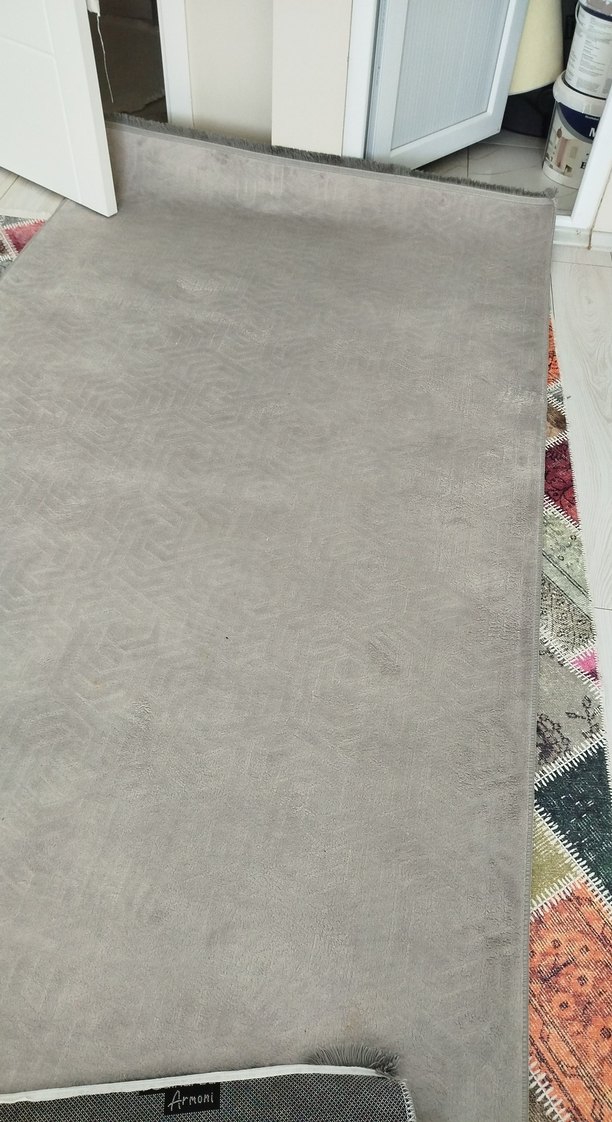 Modern tarzda, desensiz ve gri renkte, hafif dokulu bir halı. sıfır alınmış sadece bir kere serdim koridor ve giriş iki parça halinde şuan kirli yıkanması lazım giriş ölçüsü genişlik 150 uzunluk 3 40 koridor genişlik 1 uzunluk 3