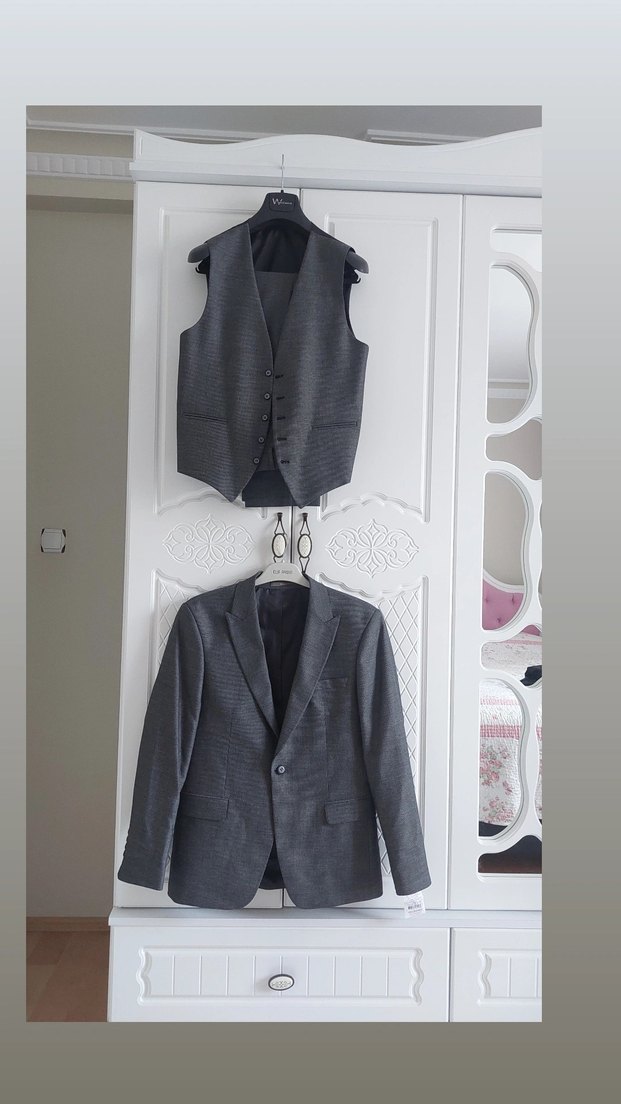 CEKET,YELEK,PANTOLON TAKIM. sadece 1 kere nikahta giyildi hiçbir sorunu yoktur. ceketi dolapta biraz kırışmış sadece. çok güzel bir takım. Rengi fotoğraflarda açık yada koyu çıkıyor çok koyuda değil çok açıkta değil güzel bir rengi var. dolabımda farklı bir çok ürün mevcuttur uğramadan geçmeyin. #takımelbise #gri #siyah #düğün #nikah #nişan #söz #ceket #gömlek #kravat #damat #kığılı #altınyıldız #mavi #slimfit