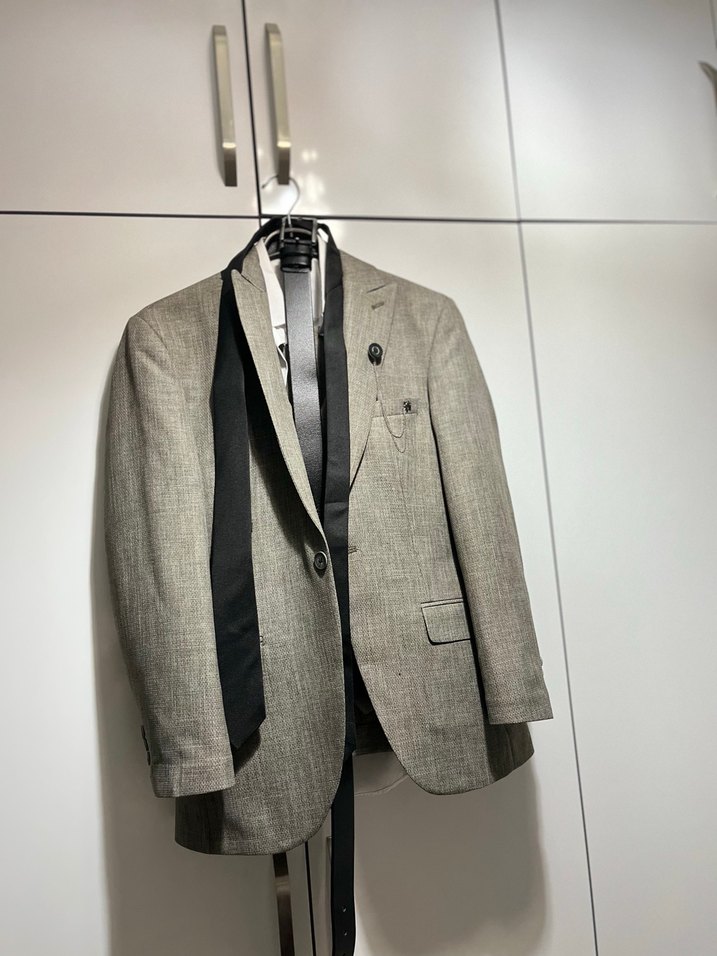 Gri renkte, düğmeli ve kesimli yakalı erkek takım elbisesi, modern klasik tarzda, sadece 1 defa giyildi