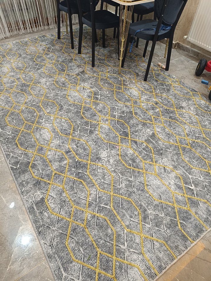 Gri modern klasik halı, yılan desenli ve sarı geometrik çizgilerle şık bir görünüm sunar. tabani jel . yeni en son fiyattır kesinlikle pazarlık yoktur 200*310