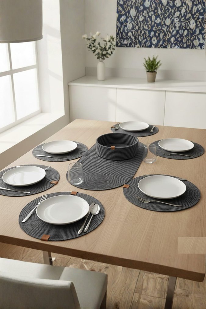 Gri renkte, desensiz modern masa örtüsü seti; yuvarlak Amerikan servisler ve oval masa koşucusundan oluşur. ️
