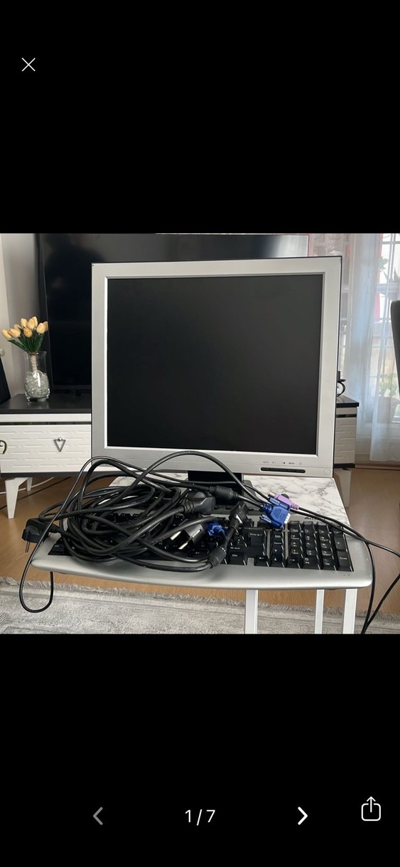 Masaüstü kullanım için gri monitör, klavye ve çeşitli kablolar içeren set.