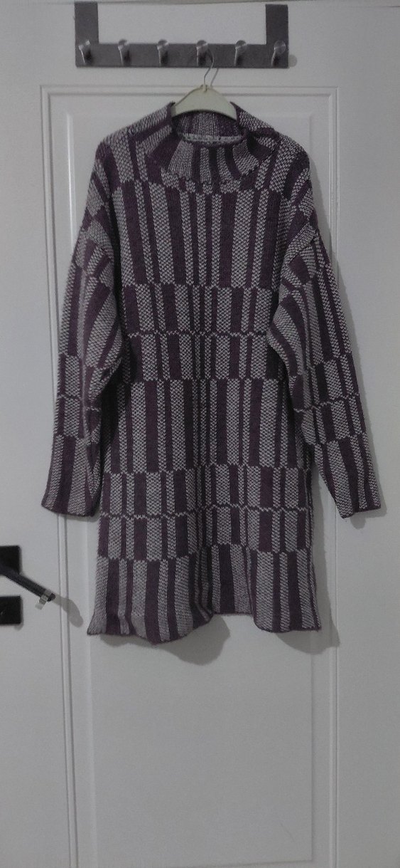 Yüksek yakalı, uzun kollu ve bol kesim gri örgü kadın kazak. Geometrik desenli, uzun boylu ve rahat bir yapıya sahip. 40/44 beden uyumlu. Sıcacık Marka temsilidir.